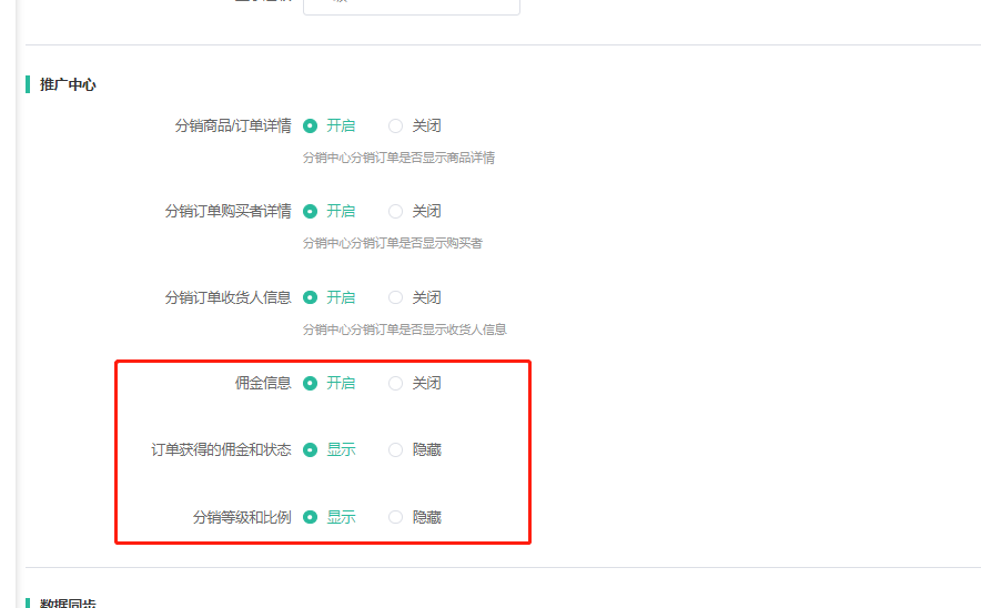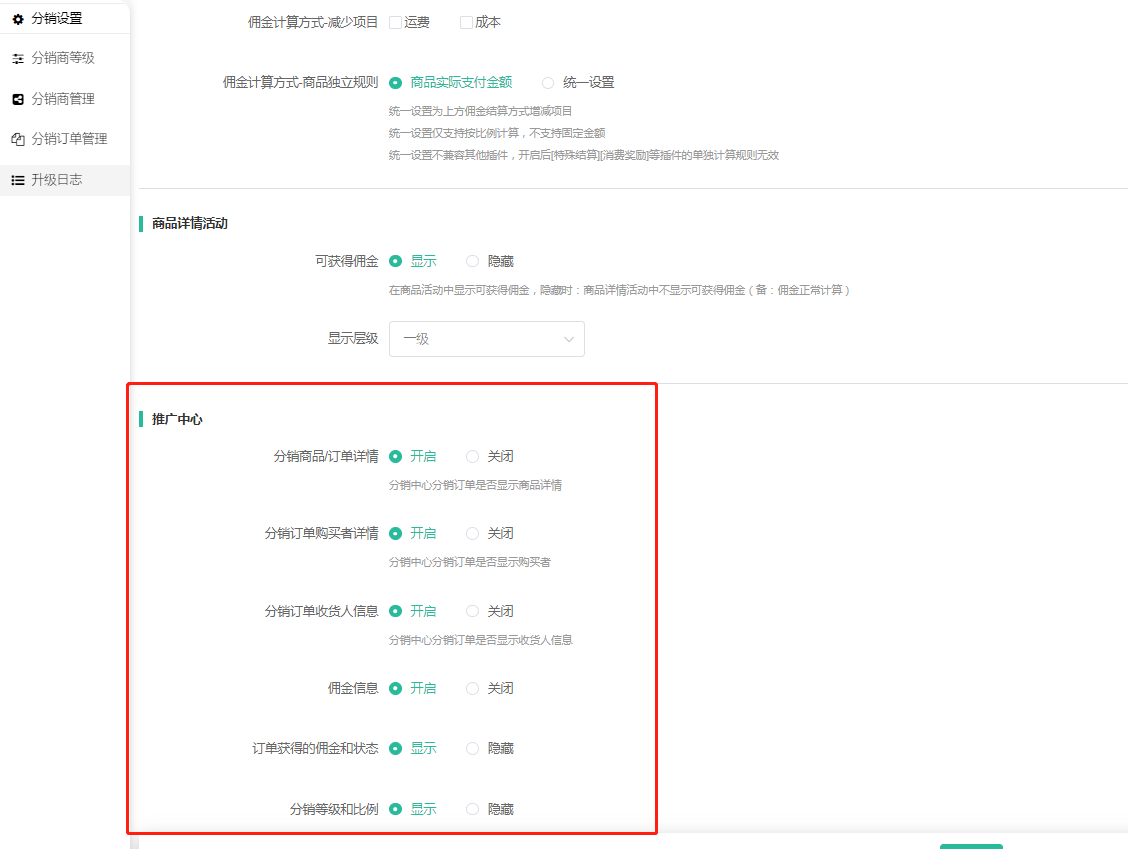 佣金信息,订单获得的佣金状态,分销等级和比例设置开启关闭效果如下