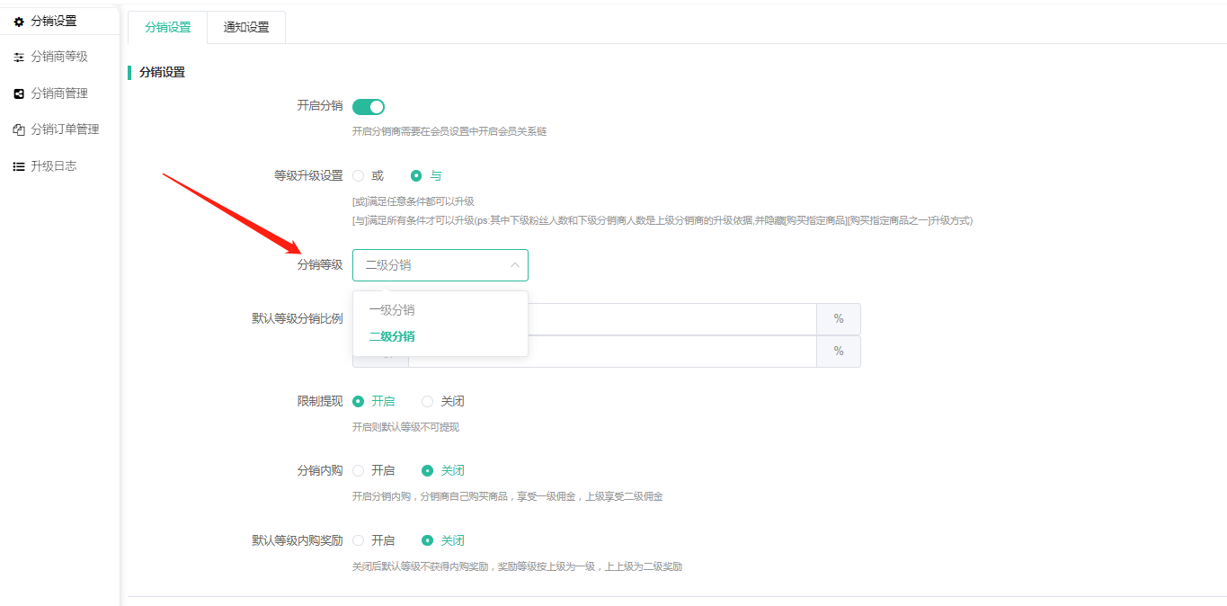 限制提现:开启限制提现,默认等级分销商则不可操作所有收入提现申请,开启后前端申请时会显示:不满足分销商等级,不可提现。